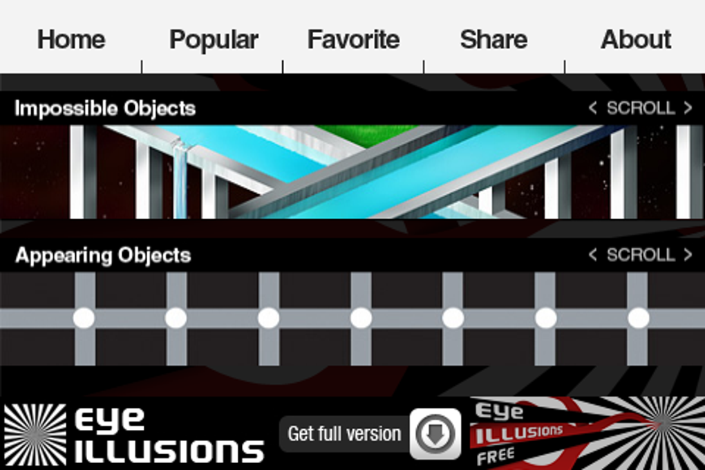 Eye Illusions está disponible para usuarios con sistema operativo iOS 3.0 o posterior, y solo está disponible en Inglés. La última versión del programa es 1.1 y se actualizó en 13/07/2011.